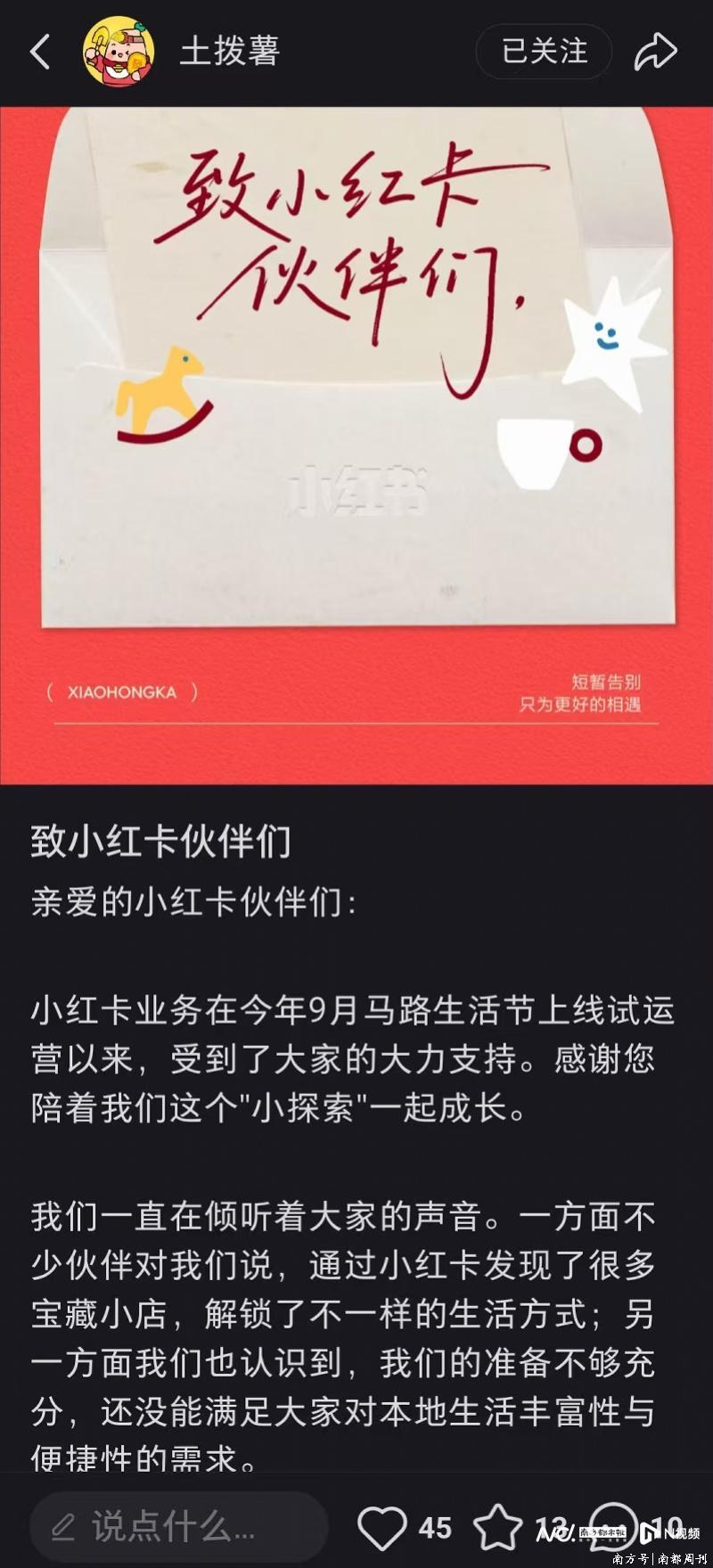 12月9日,南都N视频记者从小红书官方账号“土拔薯”处获悉,“小红卡”业务将于2026年1月1日起暂停试运营。