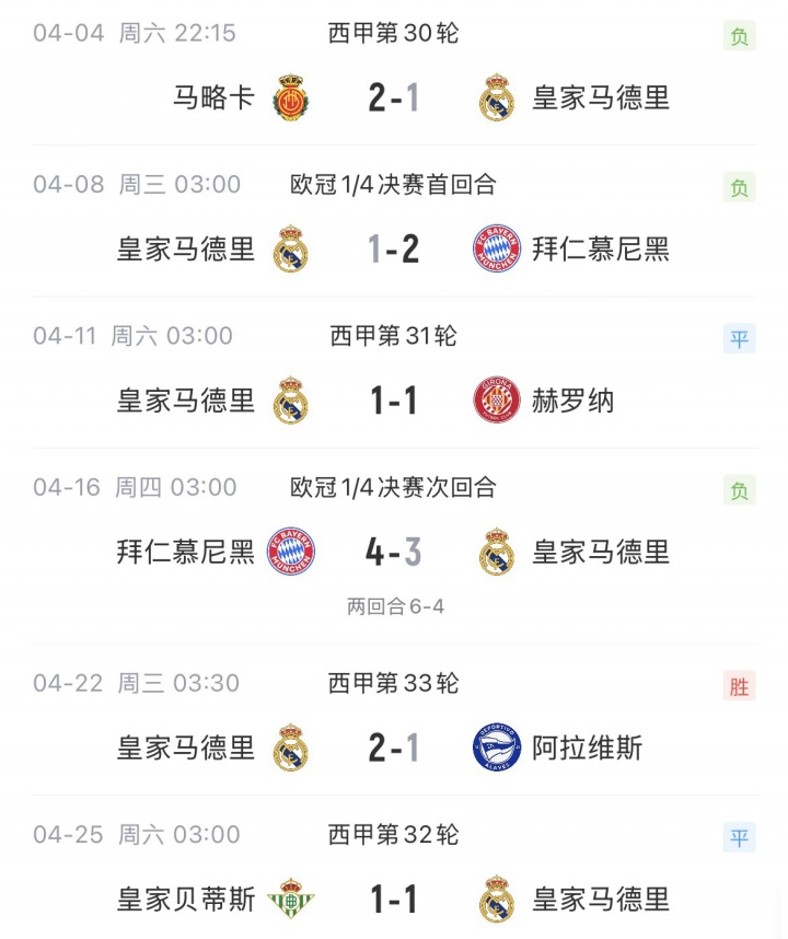 04月25日讯 皇马1-1遭贝蒂斯绝平,四月份6场比赛只赢了一场。