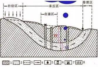 1.隔水层;2.含水层;3.地下水测试面;4.地下水流向;5.泉(上升泉);6.钻孔(虚线部分为进水部分)7.自喷孔;8.大气降水补给;H.与含水层顶面压力相当的高度;M.含水层