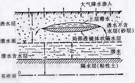 2. 潜水:饱水带中第一个具有自由表面的含水层中的水称为潜水。潜水没有隔水顶板,或只有局部的隔水顶板。