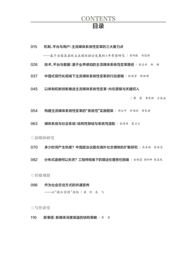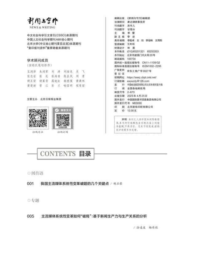 张志安和冉桢在《新闻与写作》2025年第4期撰文《》指出,推动主流媒体系统性变革,构建适应全媒体生产传播工作机制和评价体系,是当前中国主流媒体深度融合、新闻业转型发展的关键任务。在简要梳理媒体融合十年探索实践的基础上,结合面向新闻媒体负责人的访谈材料,主流媒体系统性变革的三个关键要素可概括为技术、平台和数据。在技术层面,主流媒体应当持续通过技术吸纳与应用场景研发,实现生产链条重构、有效用户触达与社会治理参与。在平台层面,主流媒体应当在做大做强自主客户端的同时,积极推进与互联网平台的关系整合,实现流量共享、技术共创与数字生态共治。在数据层面,主流媒体应当以数据真实、分类评价和注重实效为基础,构建起基于“流量和数据”的全新评价体系,同时实现社会效益和经济效益的可持续平衡。