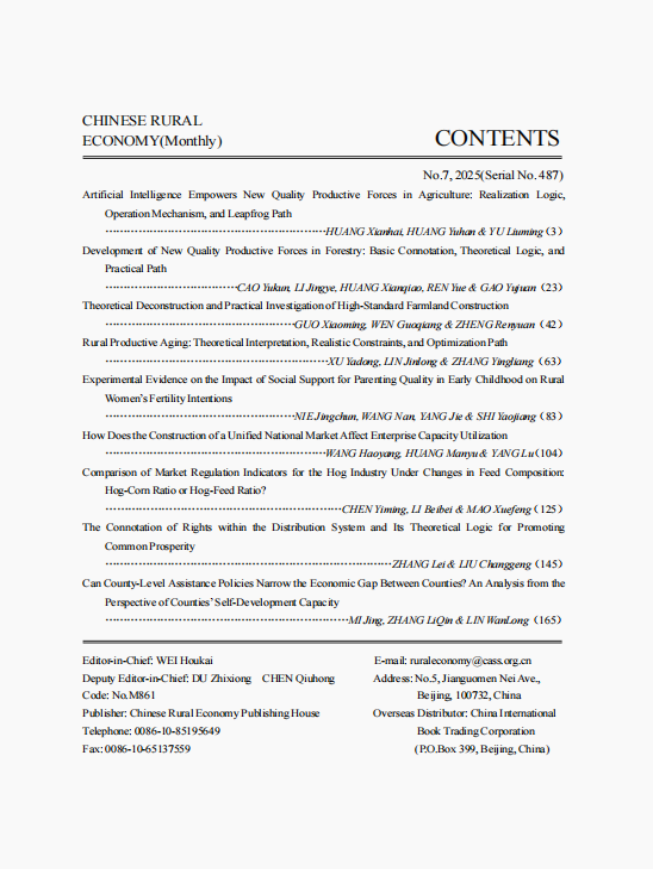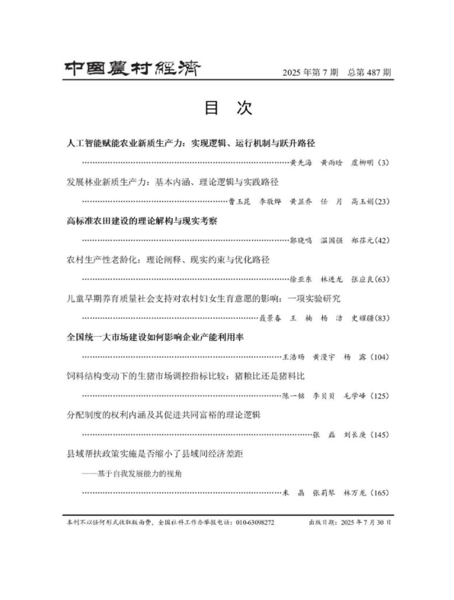 黄先海等在《中国农村经济》2025年第7期撰文《》指出,农业新质生产力是以人工智能等前沿科技为赋能引擎,依托新质生产要素的内涵拓展与组合创新,以农业全要素生产率大幅跃升为核心标志,体现为高科技、高效率、高质量的现代农业发展新形态。农业新质生产力对农业高质量发展和农业强国建设意义重大。中国作为典型的超大规模经济体,具备人口规模巨大、市场空间广阔等优势,为人工智能提供了海量数据支撑和丰富应用场景。人工智能通过延伸人类体力与脑力边界,推动劳动资料智能化转型,加速劳动对象的创新与拓展,全方位优化要素组合空间,为活跃型、强韧型、高效型、智慧型的农业新质生产力提供了强劲的发展动能。尽管中国在“AI+农业”领域已取得革命性成果,但仍面临人力资本双元失衡、关键技术路径依赖、数据要素价值沉寂、应用场景支撑缺位等现实制约。为构建具有中国特色的现代农业新质生产体系,需聚焦人才引育、技术攻关、数据统筹与场景创新四大战略支点,因地制宜发展农业新质生产力,从而加快推进中国的农业农村现代化进程。