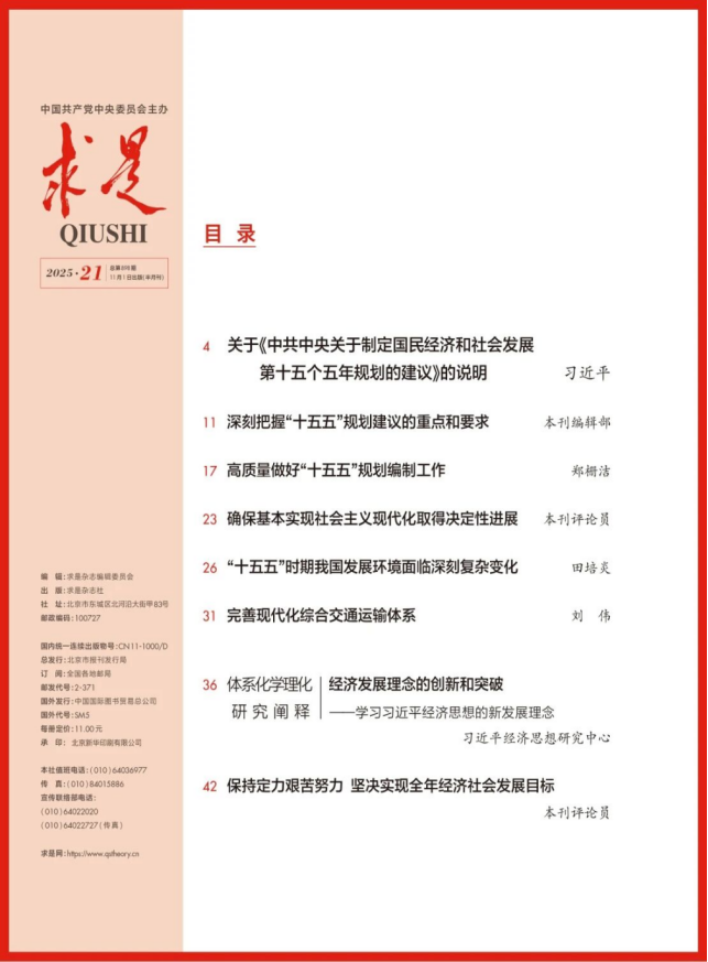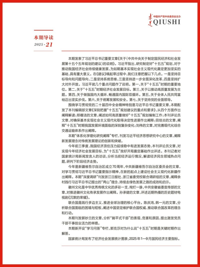 《求是》2025年第21期刊发习近平总书记重要文章《》指出,在《建议》稿起草过程中,我们注意把握以下几点。一是坚持目标导向和问题导向,立足于夯实基础、全面发力的基本定位,以为基本实现社会主义现代化目标奠定更加坚实的基础为着眼点进行系统谋划,以有力有序有效应对世界百年变局的新形势和发展中突出问题为着力点补短板、强弱项。二是坚持系统思维,按照统筹推进“五位一体”总体布局、协调推进“四个全面”战略布局的要求,全面部署经济社会发展和党的建设各方面工作。三是坚持进一步全面深化改革,注重运用改革办法破解发展难题,为发展增动力、激活力。四是坚持扩大对外开放,既把发展放在自己力量基点上,又统筹用好全球要素和市场资源。